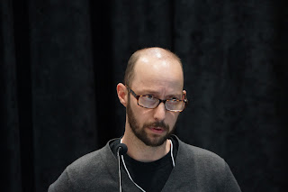 Saturday started out with a panel on poetics and new media (Clark Lunberry, Joe Milutis and Ron Silliman), and Poetics and Other Arts (Rebecca Cummins, Ted Hiebert and Barrett Watten). After lunch and general hanging out, there was a second session on poetics and other arts featuring Charlie Altieri, Lyn Hejinian and Brian Reed. The afternoon brought us to the first of the "postings" sessions, shorter presentations by individuals and groups that ranged from the weighty to the disembodied. Niko Vassilakis shared the new LAST VISPO ANTHOLOGY with us, a book that will get a lot of attention, though my old friend and publisher Crag Hill wasn't able to join Niko as planned for the posting.